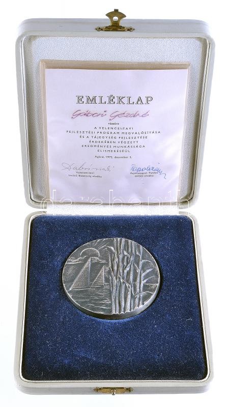 Leírás: Gáll Gyula (1939-) 1972. "15 éves a Velence Tavi Intéző Bizottság" ezüstözött Br plakett (65mm) dísztokban adományozói emléklappal T:1-