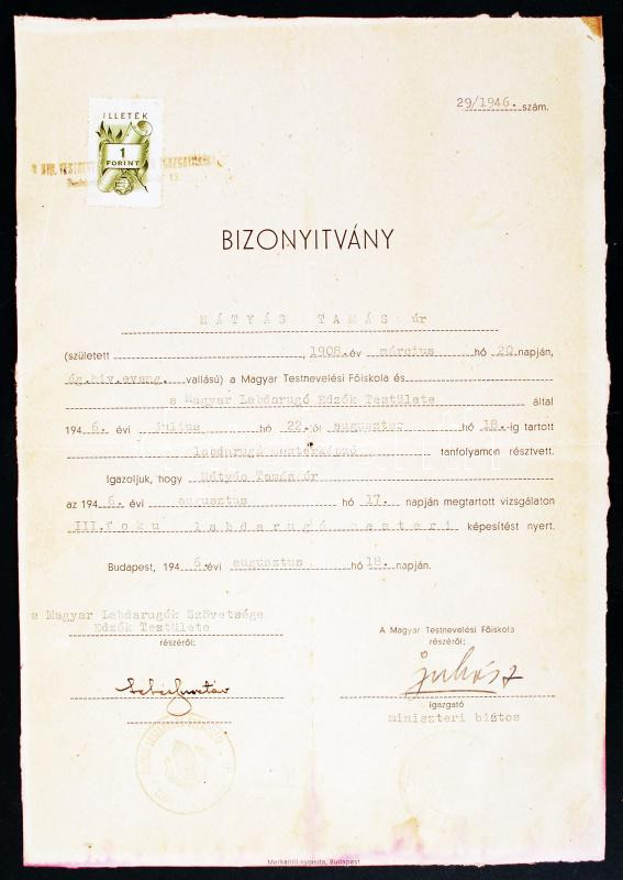 Leírás: 1946 Sebes Gusztáv MLSZ Edzők Testület vezetője és Juhász miniszteri biztos aláírása bizonyítványon