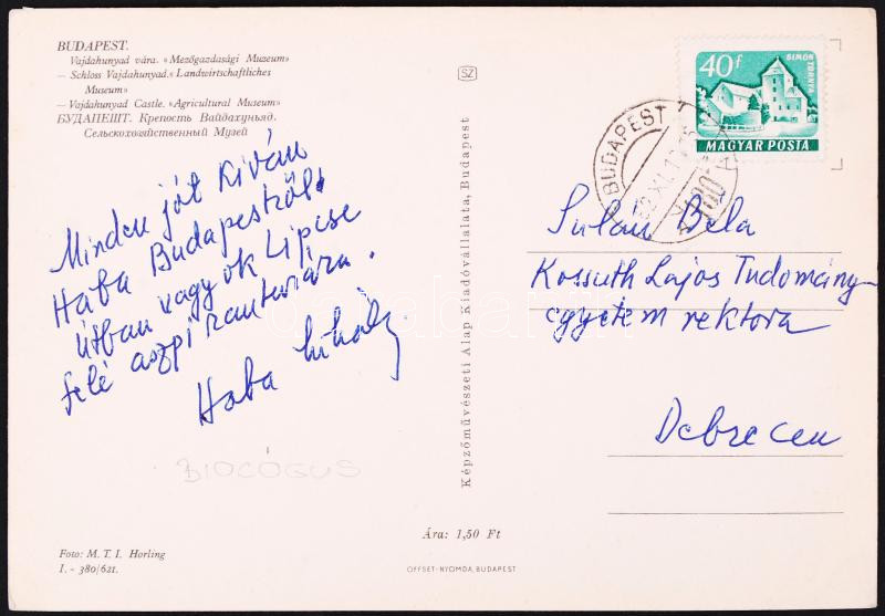 Leírás: Cca 1962 Kaba Mihály üdvözlőlapja Sulán Béla rektorhoz