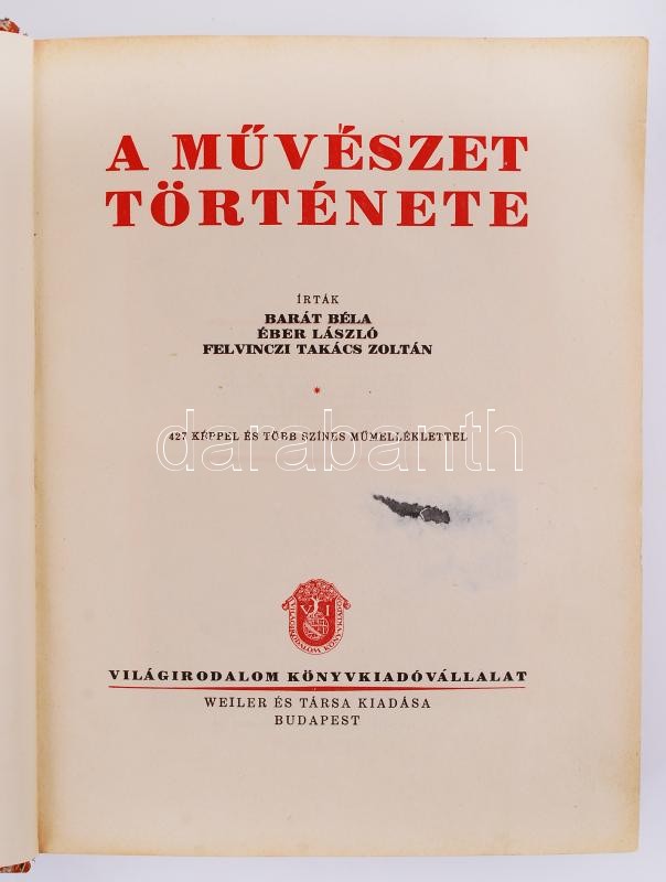 Barát Béla - Éber László - Felvinczi Takács Zoltán: A művészet története. 427 képpel és több színes műmelléklettel. Bp., 1926, Világirodalom Könyvkiadóvállalat - Weiler és Társa. Kiadói aranyozott félbőr kötésben, jó állapotban, ex librisszel
