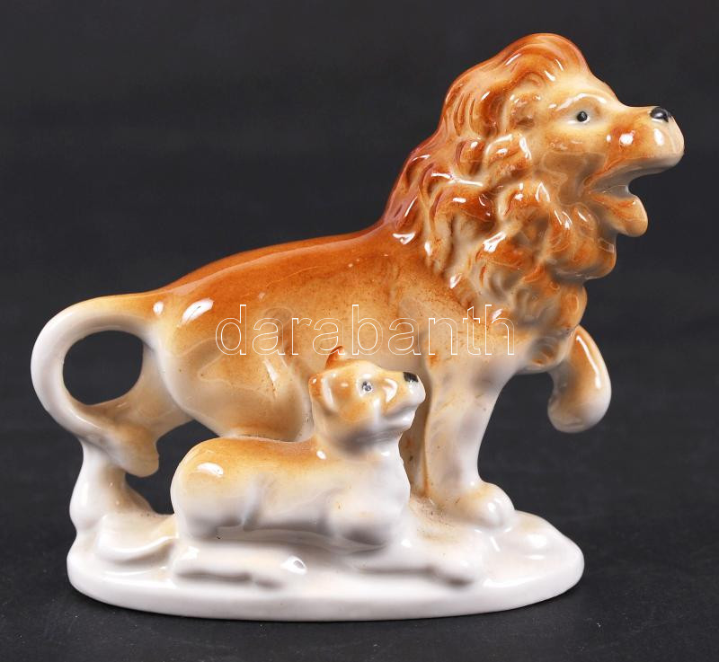 Leírás: Oroszlán gyermekével, porcelán figura (a mázon apró kopásokkal) /