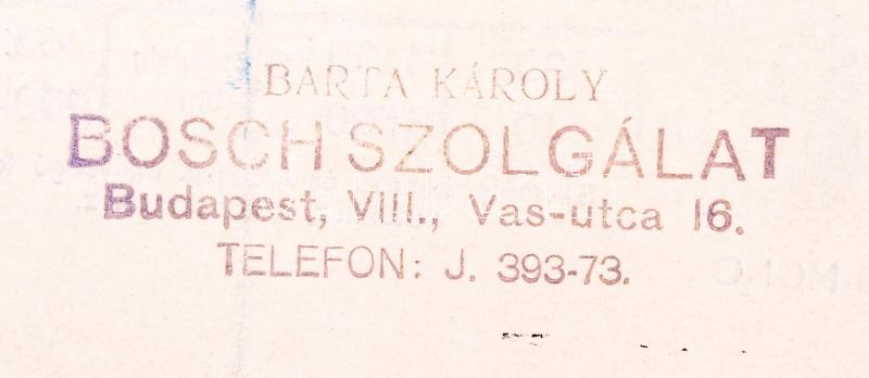 Leírás: 1930-as évek Bosch lökhárító, reklámnyomtatvány képekkel, árjegyzékkel, 15.2 x 21.1 cm, Bp. Elek nyomda, hátoldalán Barta Károly pecsétje