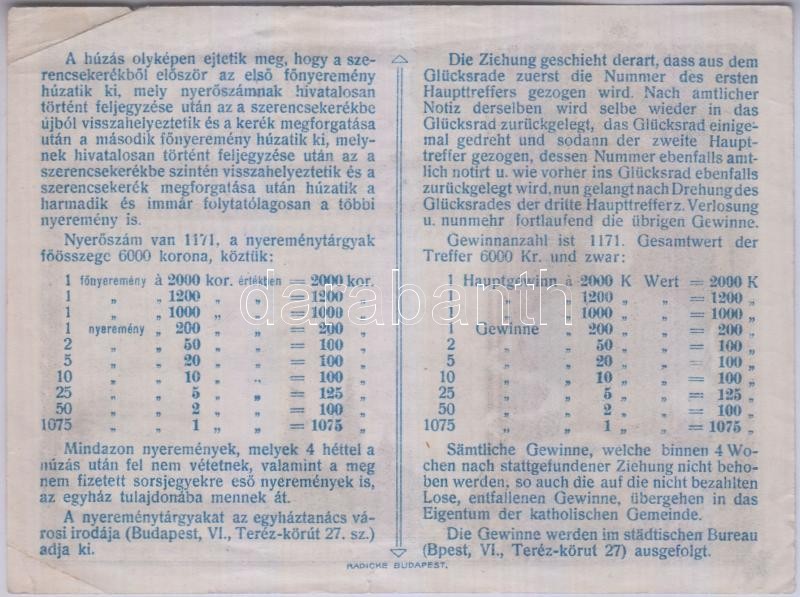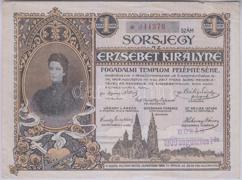 Leírás: 1908. "Sorsjegy az Erzsébet Királyné Fogadalmi Templom felépítésére" 1K értékben T:II- (hajtatlan)