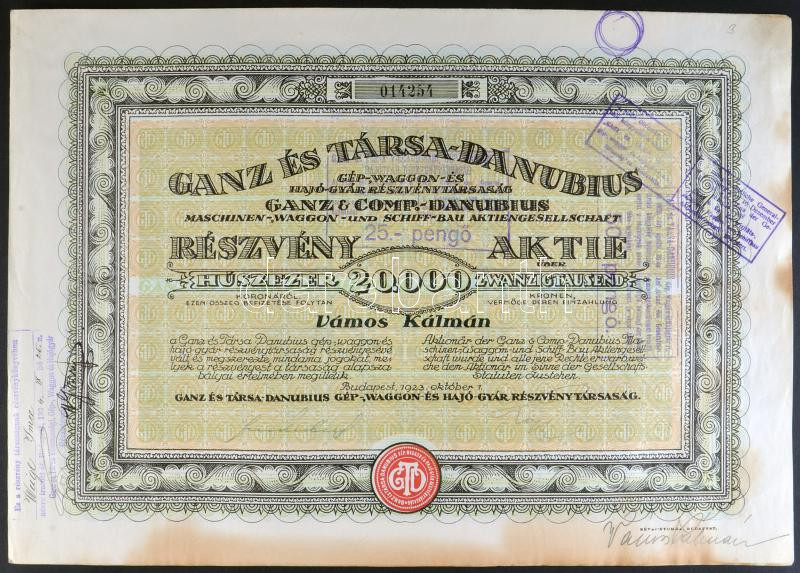 Budapest 1923. Ganz és Társa-Danubius Részvénytársaság részvénye 20.00... https://www.darabanth.com/hu/196-Gyorsarveres/196.0/Numizmatika/Reszvenyek-es-sorsjegyek~600005/Budapest-1923-Ganz-es-Tarsa-Danubius-Reszvenytarsasag-reszvenye-20000K-rol-nemet-es-ma~II756783