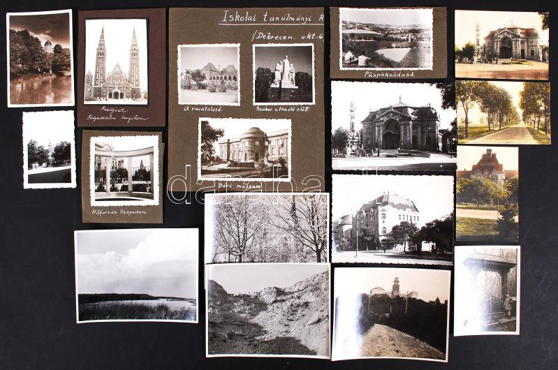 Leírás: 1932-1954 Város és tájfotók (Debrecen, Kecskemét, Szeged), részben kartonra ragasztva, hátoldalukon az évszám és helységnév feltüntetésével, 23 db.