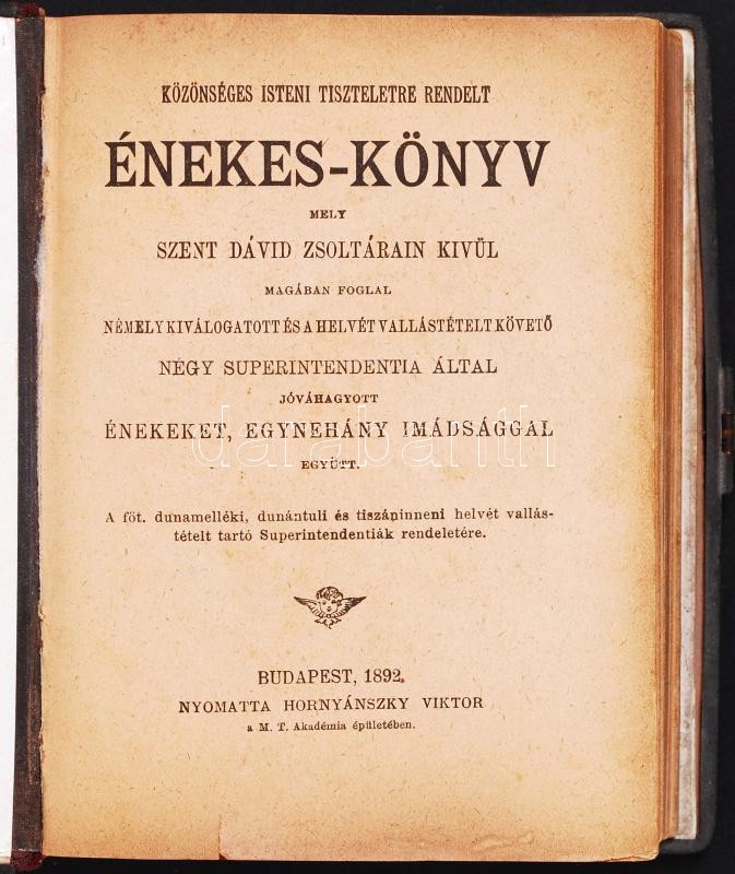 Leírás: Közönséges isteni tiszteletre rendelt énekes-könyv.... Bp., 1892 Hornyánszky. Aranyozott lapszélekkel, rézveretes szaruborítással, kapcsos