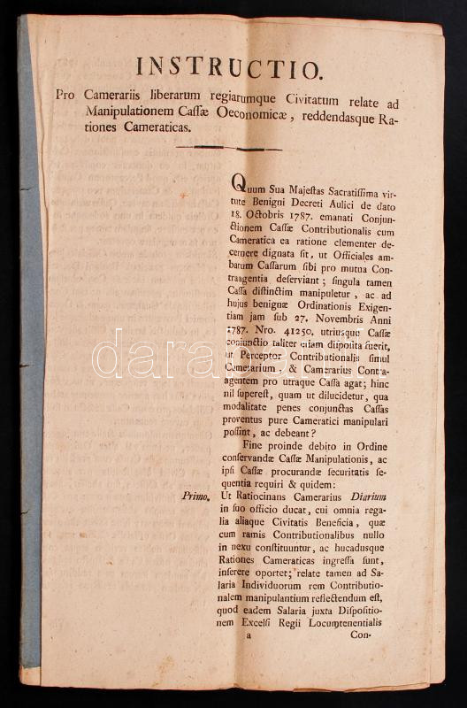 1787 Utasítás szabad királyi városok részére gazdasági ügyekkel kapcso... https://www.darabanth.com/hu/197-Gyorsarveres/197.0/Festmeny-mutargy-papirregiseg-egyeb/Okmanyok~600016/1787-Utasitas-szabad-kiralyi-varosok-reszere-gazdasagi-ugyekkel-kapcsolatban-10-lap~II759712