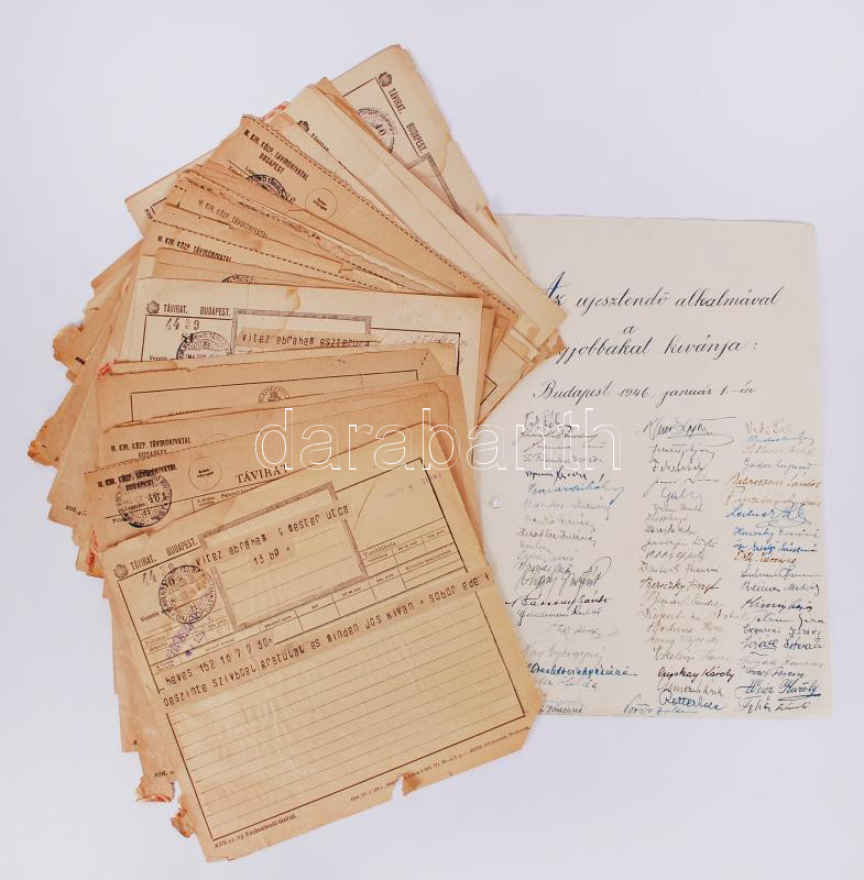 1944-1946 kb 30 db távirat, újévi köszöntő több mint 40 aláírással https://www.darabanth.com/hu/197-Gyorsarveres/197.0/Festmeny-mutargy-papirregiseg-egyeb/Okmanyok~600016/1944-1946-kb-30-db-tavirat-ujevi-koszonto-tobb-mint-40-alairassal~II759279