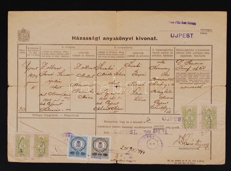 1944 Házassági anyakönyvi kivonat 4 x 50f okmánybélyeggel + 8-as fogaz... https://www.darabanth.com/hu/197-Gyorsarveres/197.0/Festmeny-mutargy-papirregiseg-egyeb/Okmanyok~600016/1944-Hazassagi-anyakonyvi-kivonat-4-x-50f-okmanybelyeggel-plus-8-as-fogazasu-Budapest-varosi-bC3~II763876