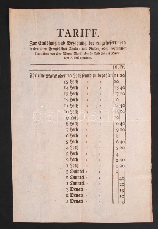 Leírás: Német nyelvű táblázat régi francia tallérok, guldenek és Lajos-aranyak átváltási áráról a bécsi forintra, vízjeles papíron.