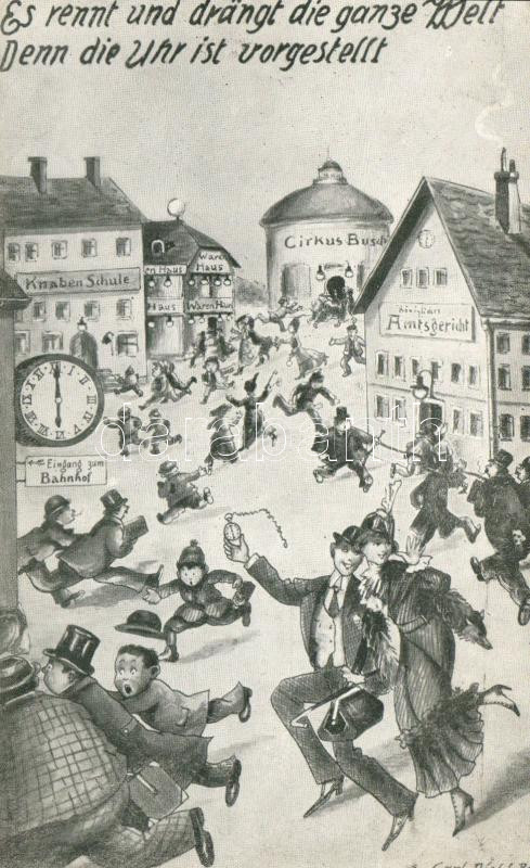 Leírás: Es rennt und drängt die ganze Welt Denn die Uhr ist vorgestellt / Humour, artist signed
