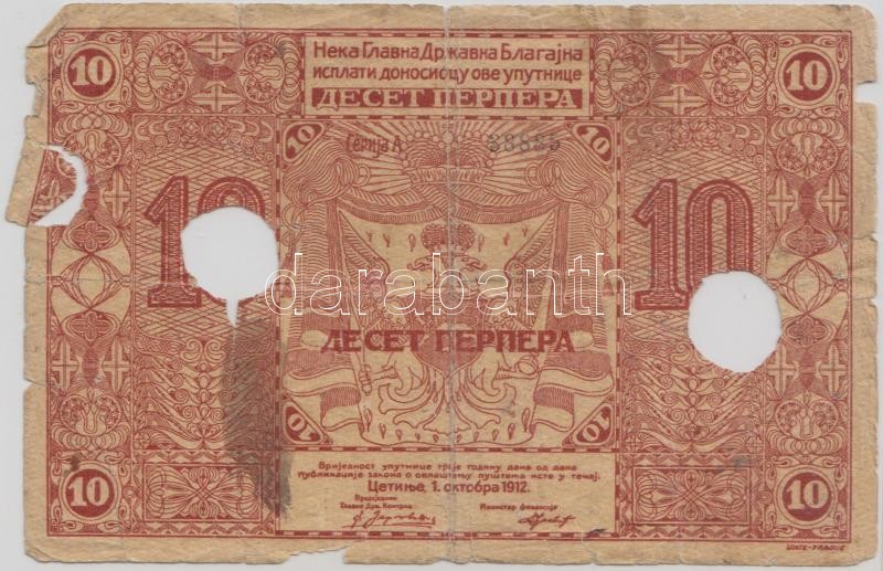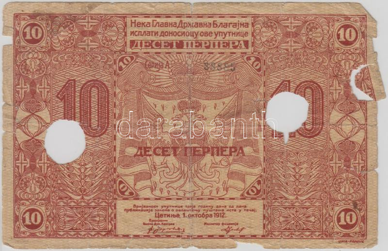 Montenegro 1912.... https://www.darabanth.com/hu/197-Gyorsarveres/197.0/Numizmatika/Kulfoldi-bankjegyek~400011/Montenegro-1912-10P-hivatalos-lyukasztassal-TIV-R-3Cbr3EMontenegro-1912-10-Perper-with-official~II765021