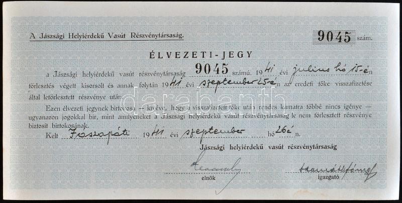 Jászladány 1911. "Jászsági Helyi Érdekű Vasút Részvénytársaság" 200K-ról szóló Elsőbbségi Részvény + Jászapáti 1938. Élvezeti-jegy "Jászsági Helyi Érdekű Vasút Részvénytársaság" részvényhez T:I