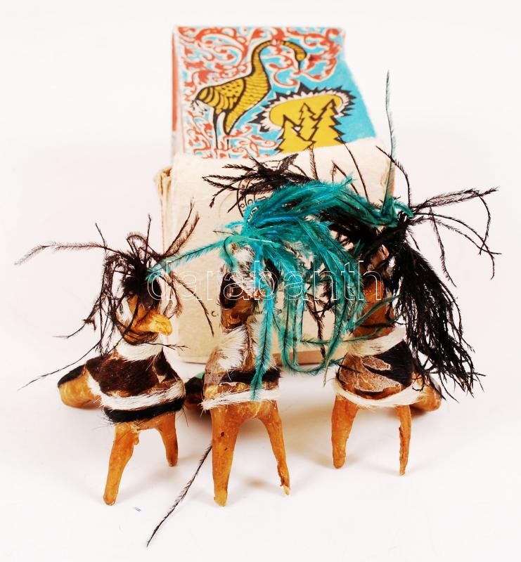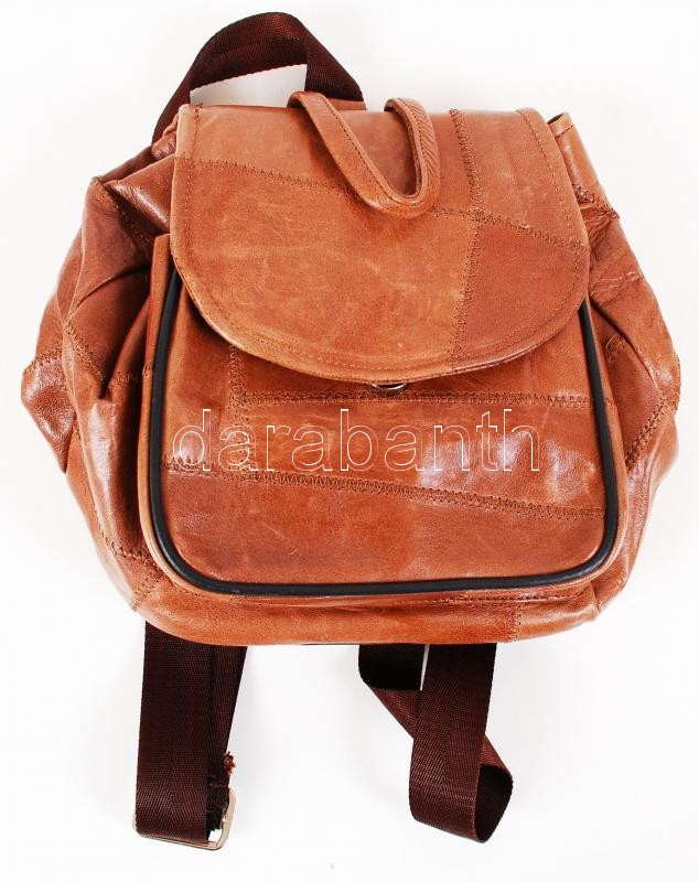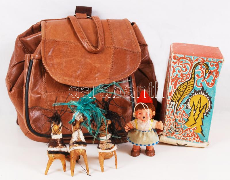 Kis bőr hátizsák, benne 5db játékfigura (műanyagból, ill. szaruból) / Leather backpack with 5 little toys