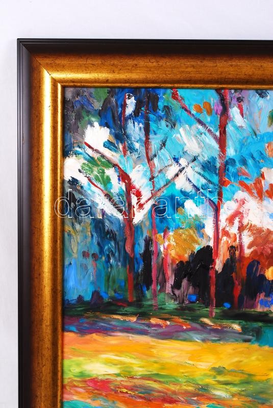 Leírás: Schéner Mihály (1923-2009): Tájkép. Olaj, farost, jelzett, újszerű keretben, 50×70