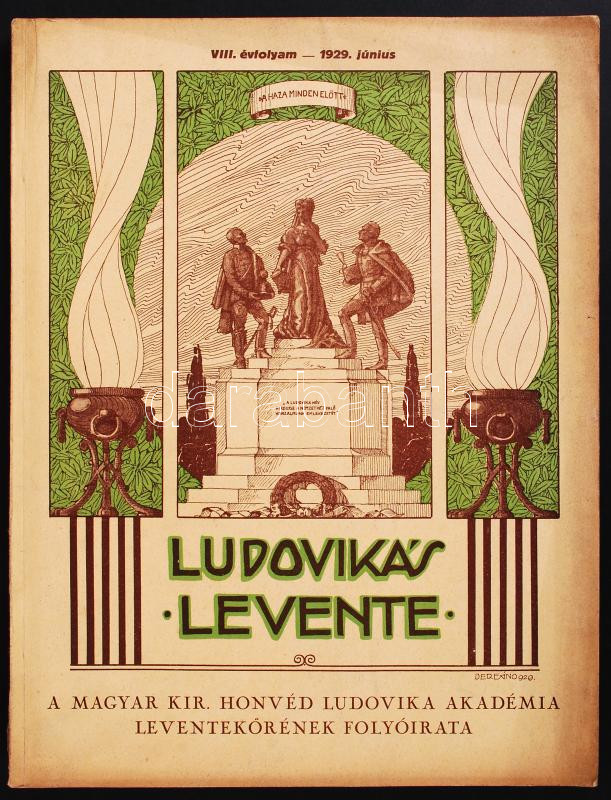 Vegyes tétel: 1929 Ludovikás Levente, VIII/június, melléklettel (Hadak Útján), 1927 Ludovikás Levente, VI/június, 1928 Ludovikás Levente, VII/június, 1925 Ludovikás Levente, IV/1, mellékelve a M. Kir. Honvéd Ludovika Akadémia sportünnepélyének műsora, 1925 Ludovikás Levente, IV/1, mellékelve a M. Kir. Honvéd Ludovika Akadémia sportünnepélyének műsora (sérült: a címlap levált).