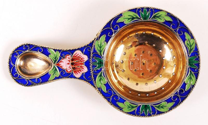 Aranyozott ezüst (Ag.)teaszűrő, jelzett, rekeszzománc díszítéssel, bru... https://www.darabanth.com/hu/198-Gyorsarveres/198.0/Festmeny-mutargy-papirregiseg-egyeb/Nemesfem-Disztargyak-Orak-es-Ekszerek~200034/Aranyozott-ezust-Agteaszuro-jelzett-rekeszzomanc-diszitessel-brutto43-g-d7-cm-Gol~II768623