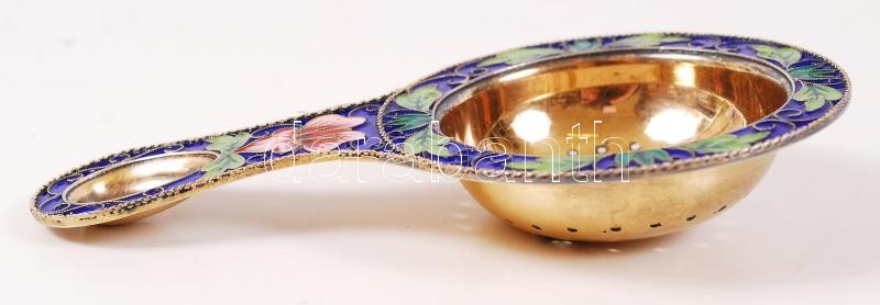 Leírás: Aranyozott ezüst (Ag.)teaszűrő, jelzett, rekeszzománc díszítéssel, bruttó:43 g, d:7 cm / Gold plateted silver teafilter