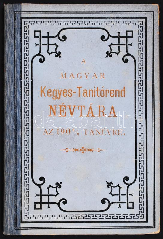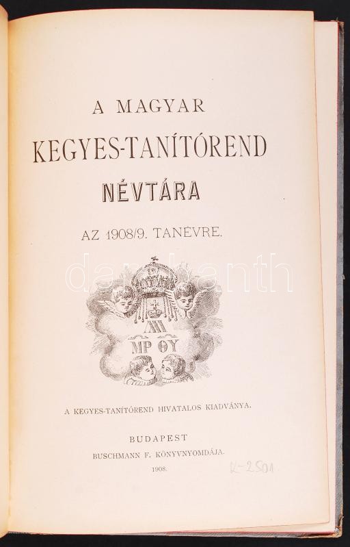 1908 A magyar kegyes-tanítórend névtára az 1908/9-dik tanévre. Bp., 19... https://www.darabanth.com/hu/198-Gyorsarveres/198.0/Festmeny-mutargy-papirregiseg-egyeb/Nyomtatvanyok~200008/1908-A-magyar-kegyes-tanitorend-nevtara-az-19089-dik-tanevre-Bp-1908-Buschmann-F-Konyvn~II768606