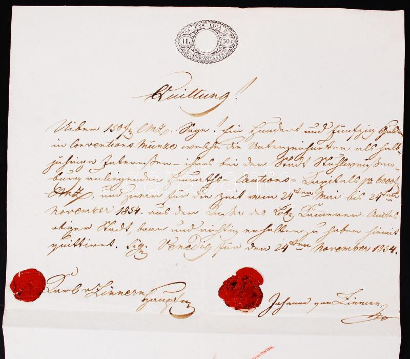 Leírás: 1854 1 Lira 50 Cent-es szignettás irat Velencéből