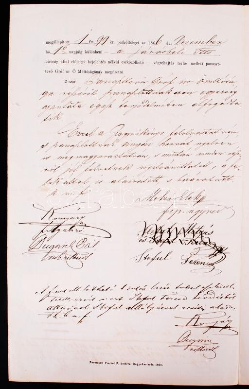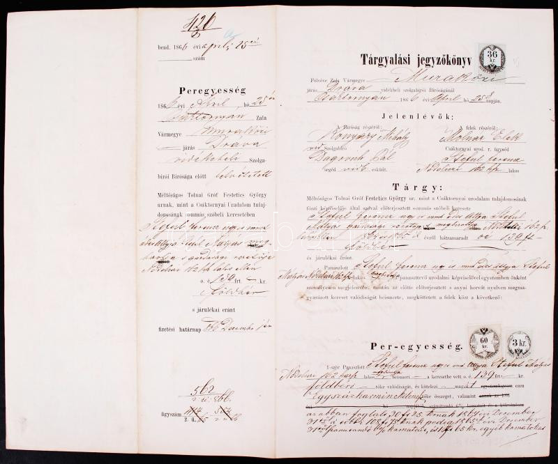 Leírás: 1866 Csáktornya, Tárgyalási jegyzőkönyv gróf Festetics György által előterjesztett kereset ügyében, illetékbélyegekkel.