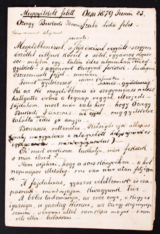 Leírás: 1879, Ócsa, Szabó Géza evangélikus lelkész verse laptöredéken, gyászbeszéd kézírással.