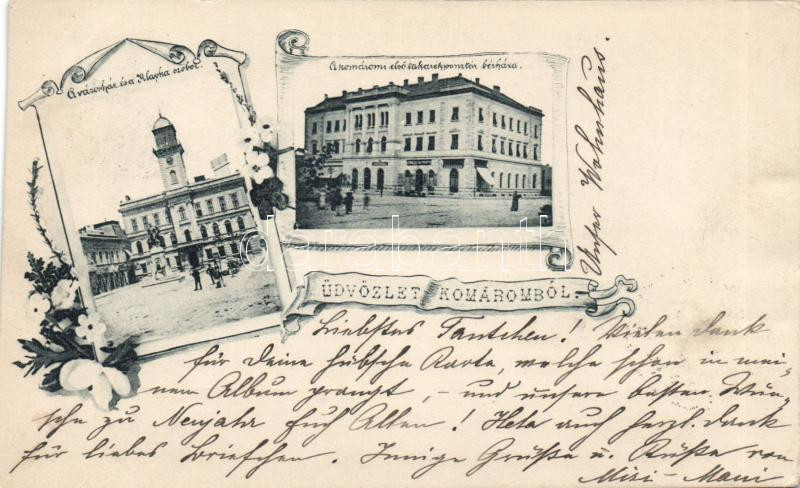 Leírás: 1899 Komárom, városháza, a takarékpénztár bérpalotája / town hall, apartment house; floral (cut)