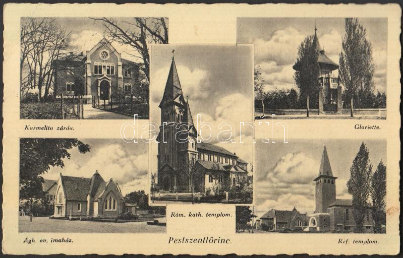 Leírás: Budapest XVIII. Pestszentlőrinc, Karmelita zárda, Gloriette, Evangélikus imaház, Római katolikus és Református templom (EB)