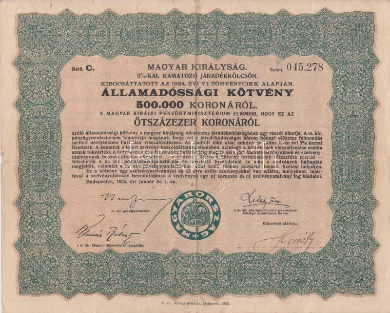 Budapest 1925. Magyar Királyság 5%-kal kamatozó Járadékkölcsön Államad... https://www.darabanth.com/hu/198-Gyorsarveres/198.0/Numizmatika/Reszvenyek-es-sorsjegyek~5/Budapest-1925-Magyar-Kiralysag-525-kal-kamatozo-Jaradekkolcson-Allamadossagi-Kotveny-500~II770343