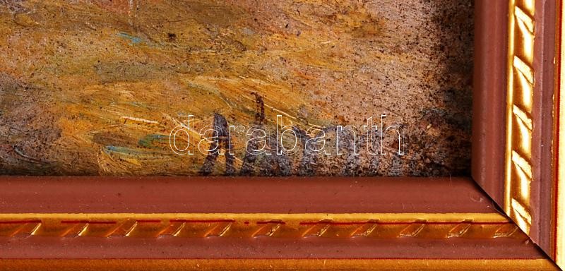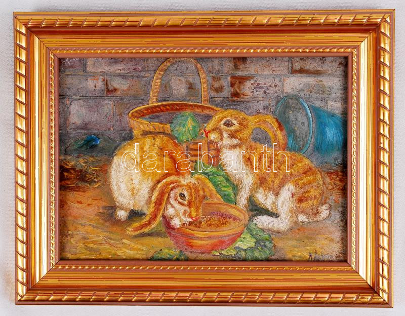 Leírás: Olvashatatlan jelzéssel: Nyulak. Olaj, farost, dombornyomott felületre, jelzett, keretben, 21x16 cm.