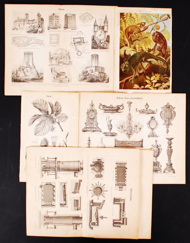 1886 3 db gépeket ábrázoló metszet, fa metszet, Meyers Lexikonból, 21×27 cm; 1886 3 db vegyes témájú fa metszet és 1 db színes nyomat a Meyers Lexikonból, 20×27 cm.