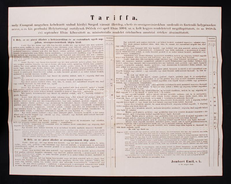 Leírás: 1859 Szeged, Nagyméretű plakát a Szegeden tartott heti és országos vásárokon szedendő helypénzekről.