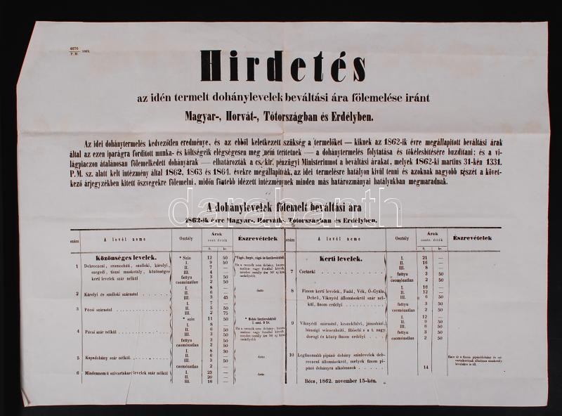 Leírás: 1862 Bécs, Hirdetés a termelt dohánylevelek beváltási árairól a Magyar Királyság területén.