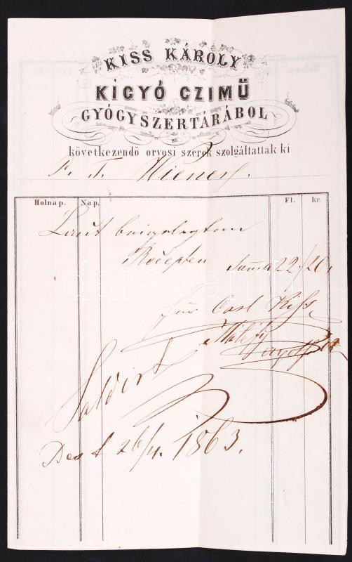 1863 Bp., V. A Kígyó Czímű Gyógyszertár fejléces számlája. https://www.darabanth.com/hu/199-Gyorsarveres/199.0/Festmeny-mutargy-papirregiseg-egyeb/Nyomtatvanyok~6/1863-Bp-V-A-Kigyo-Czimu-Gyogyszertar-fejleces-szamlaja~II764425