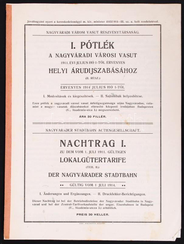 Leírás: 1914 Nagyváradi városi vasút részvénytársaság pótlék a helyi árudíjszabáshoz
