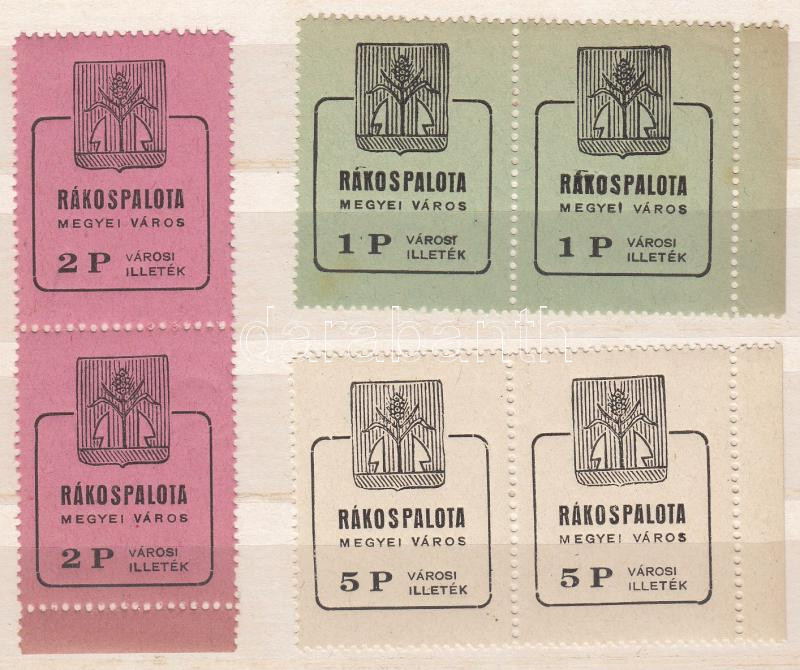 Leírás: 1945 Rákospalota "városi illeték" bélyegek 1P, 2P, 5P ívszéli párokban