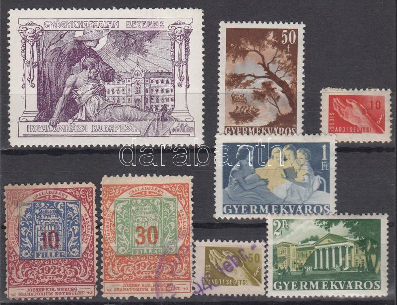 Leírás: Gyógyíthatatlan betegek irgalomháza, Gyermekváros, Siess!Adj!Segíts!, József Kir. Herceg Szanatórium Egyesület témájú levélzárók, 8 db.
