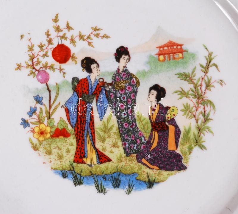 Leírás: Zsolnay gésákat ábrázoló készlet, matricás, jelzett, hibátlan, összesen: 7 db, d:23 cm, d:14 cm