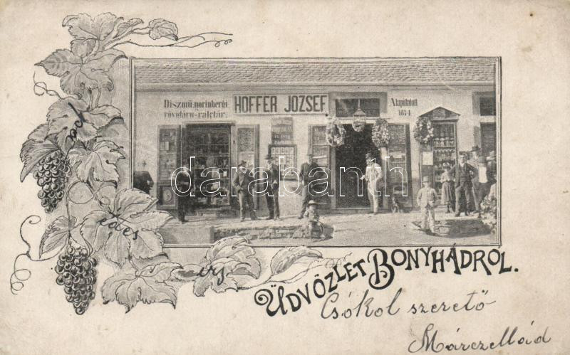 Bonyhád, Hoffer József díszmű-, norinbergi-, rövidáru raktára; floral https://www.darabanth.com/hu/199-Gyorsarveres/199.0/Kepeslapok/Magyarorszag~600007/Bonyhad-Hoffer-Jozsef-diszmu--norinbergi--rovidaru-raktara-floral~II781447