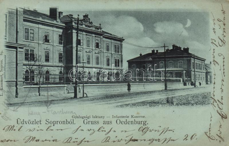 Sopron, Oedenburg; gyalogsági laktanya; kiadja L. Kummert https://www.darabanth.com/hu/199-Gyorsarveres/199.0/Kepeslapok/Magyarorszag~600007/Sopron-Oedenburg-gyalogsagi-laktanya-kiadja-L-Kummert~II781046