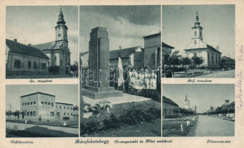 Leírás: Bácsfeketehegy evangélikus és református templomok, Fő utca, kultúrpalota / evangelical and calvinist churches, main street, Palace of Culture (fa)