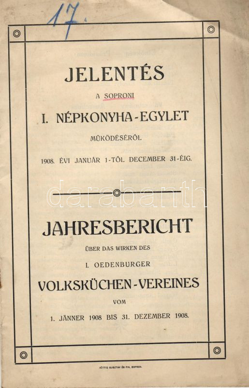 1909 Jelentés a soproni I. Népkonyha Egylet működéséről; Röttig Gusztáv és fia nyomda / Jahresbericht über das Wirken des I. Oedenburger Volksküchen-Vereines; Röttig Gusztáv u. Sohn Druckerei