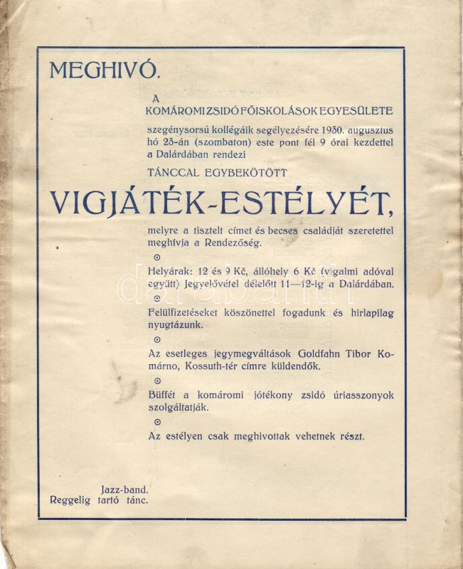 1930 Meghívó a komáromi Zsidó Főiskolások Egyesületének vígjáték estélyére; Spitzer Sándor könyvnyomdája / Einladung zum Komödienabend des Jüdischen Hochschüler-Vereins in Komárom; Buchdruckerei von S. Spitzer