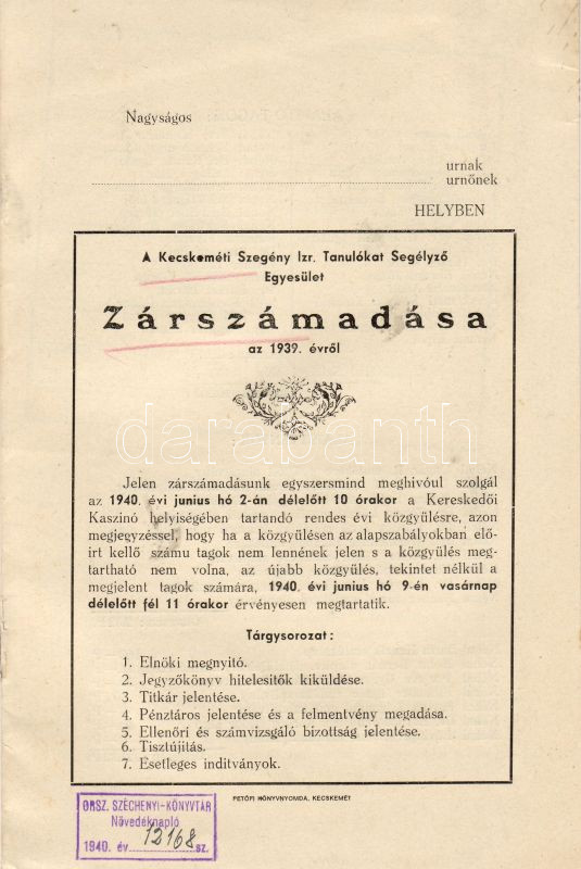 1940 A Kecskeméti Szegény Izr. Tanulókat Segélyző Egyesület zárszámadása; Petőfi nyomda / Schlussrechnung des Hilfs-Vereins für Arme Isr. Schüler in Kecskemét ; Petőfi Druckerei