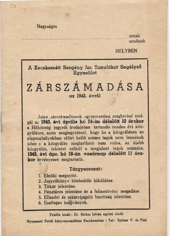 1943 A Kecskeméti Szegény Izr. Tanulókat Segélyező Egyesület zárszámadása; Petőfi nyomda Kecskemét / Schlussrechnung des Hilfs-Vereins für Arme Isr. Schüler in Kecskemét ; Petőfi Druckerei