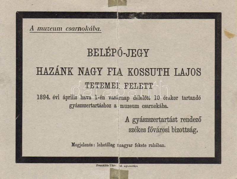1894 Belépőjegy Kossuth Lajos gyásszertartására / Eintrittskarte für T... https://www.darabanth.com/hu/2-Nagyaukcio/2.1/Mutargy-papirregiseg/Nyomtatvanyok-Drucksachen~539/1894-Belepojegy-Kossuth-Lajos-gyasszertartasara-Eintrittskarte-fur-Trauerzeremonie-von-L-Ko~II41149