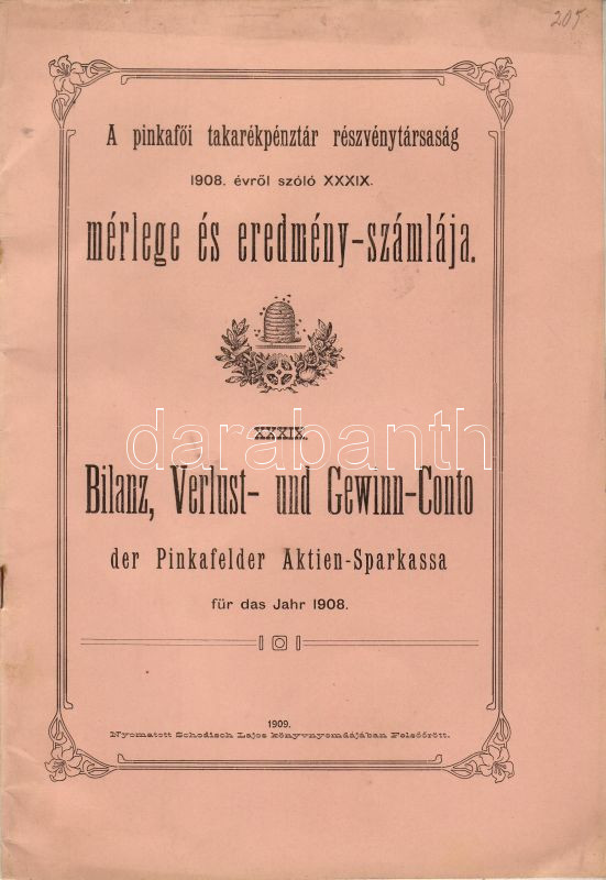 1908 A pinkafői takarékpénztár mérlege és eredményszámlája Schodisch Lajos könyvnyomdája, Felsőőr/ Bilanz, Verlust- und Gewinn-Conto der Pinkafelder Aktien-Sparkassa