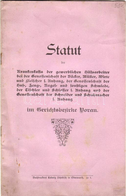 A Vorau-i cipész, szabó, pék... betegsegélyezőpénztár alapszabályai mémet nyelven / Statuten der Krankenkassa der gewerblichen Hilfsarbeiter bei der Genossenschaft der Bäcker, Müller, Wirte...; Druckerei Ludwig Schodisch