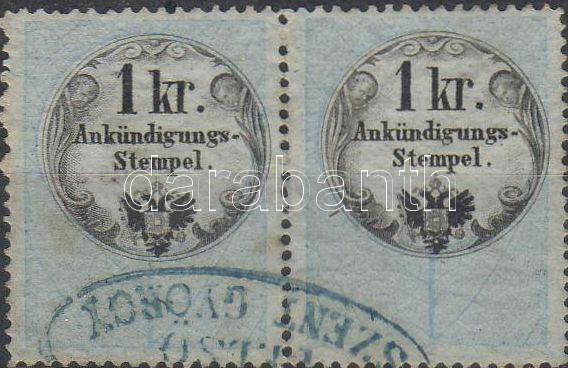 1859 1kr Hirdetménybélyeg párban/ 1kr Ankündigungs-Stempelmarke Paar https://www.darabanth.com/hu/2-Nagyaukcio/2.1/Mutargy-papirregiseg/Okmanybelyegek-Stempelmarken~530/1859-1kr-Hirdetmenybelyeg-parban-1kr-Ankundigungs-Stempelmarke-Paar~II38755