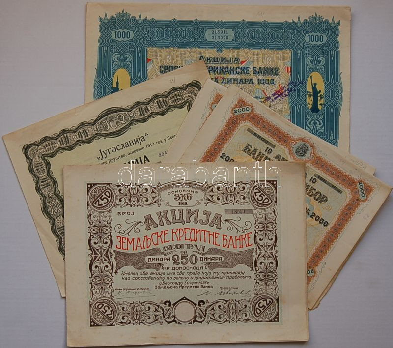 1921-1928. 5 klf jugoszláv részvény / 5 versch. Aktien aus Jugoslawien https://www.darabanth.com/hu/2-Nagyaukcio/2.1/Mutargy-papirregiseg/Tortenelmi-ertekpapirok-Historische-Wertpapiere~531/1921-1928-5-klf-jugoszlav-reszveny-5-versch-Aktien-aus-Jugoslawien~II41434